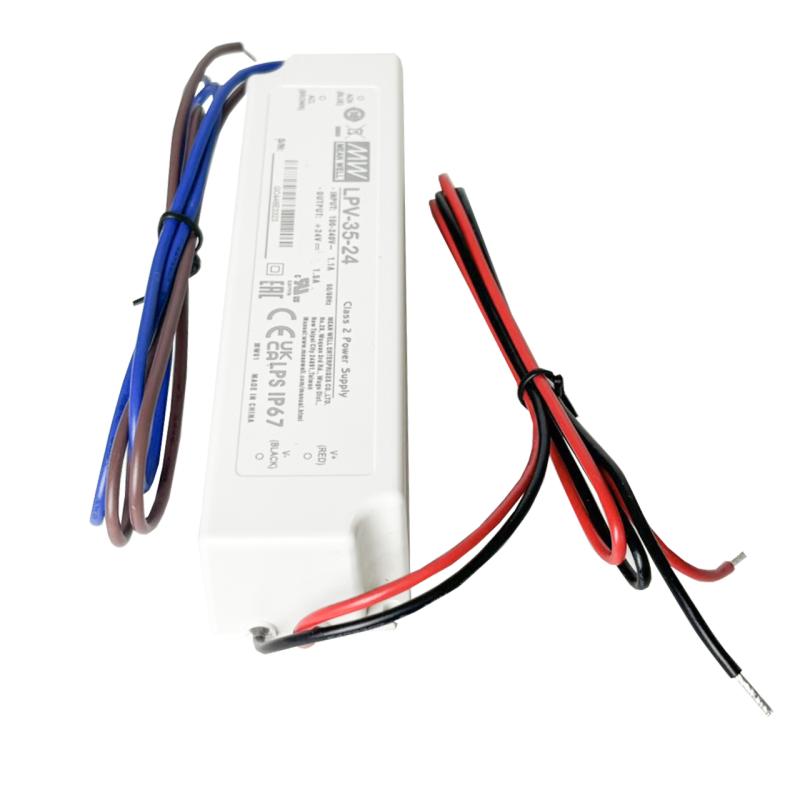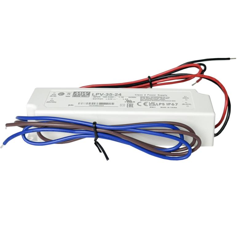 แหล่งจ่ายไฟ MEAN WELL รุ่น LPV-35-24 เป็นอะแดปเตอร์จ่ายไฟแบบกันน้ำ (IP67) ให้แรงดันคงที่ 24V กำลังไฟ 35W กระแสสูงสุด 1.5A เหมาะสำหรับใช้งานร่วมกับหลอดไฟ LED, ป้ายไฟ, งานตกแต่งภายนอกอาคาร หรือระบบที่ต้องการความเสถียรและทนทานต่อสภาพแวดล้อมภายนอก