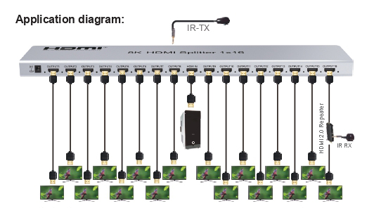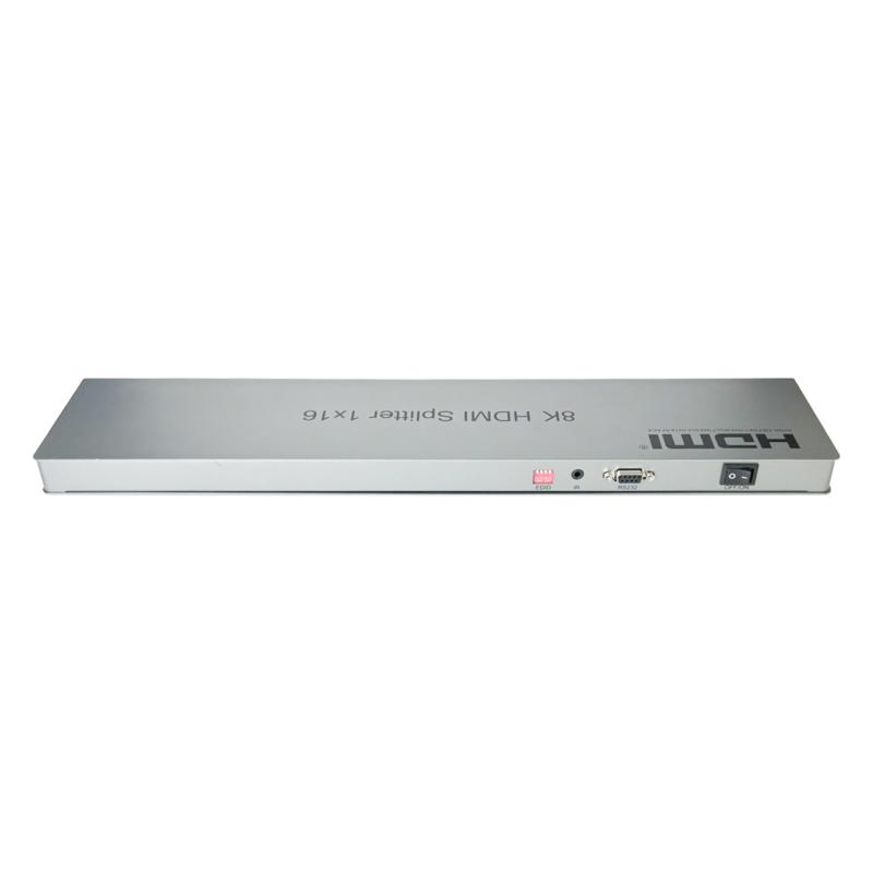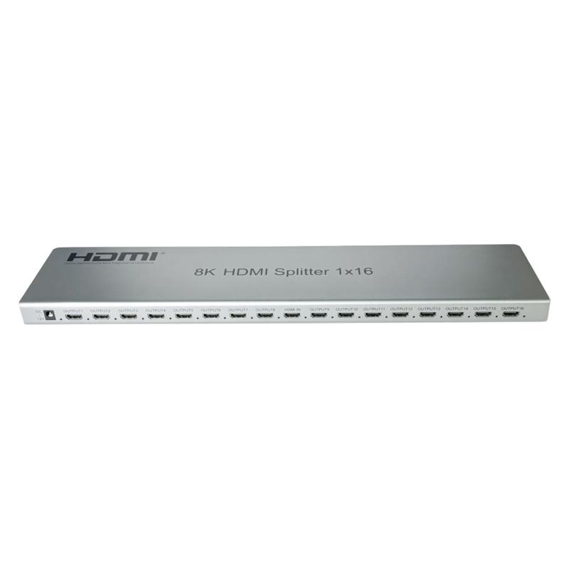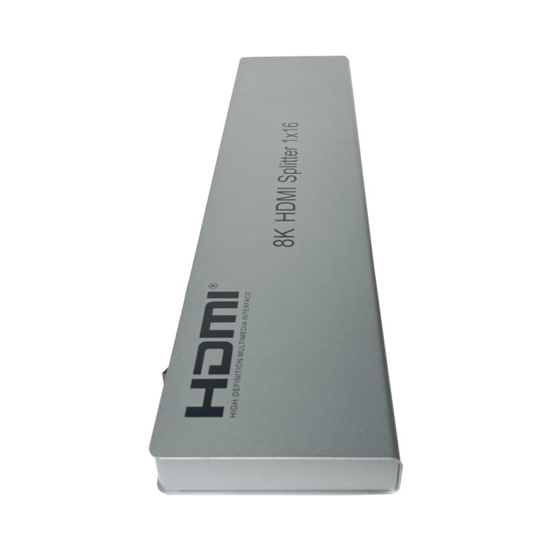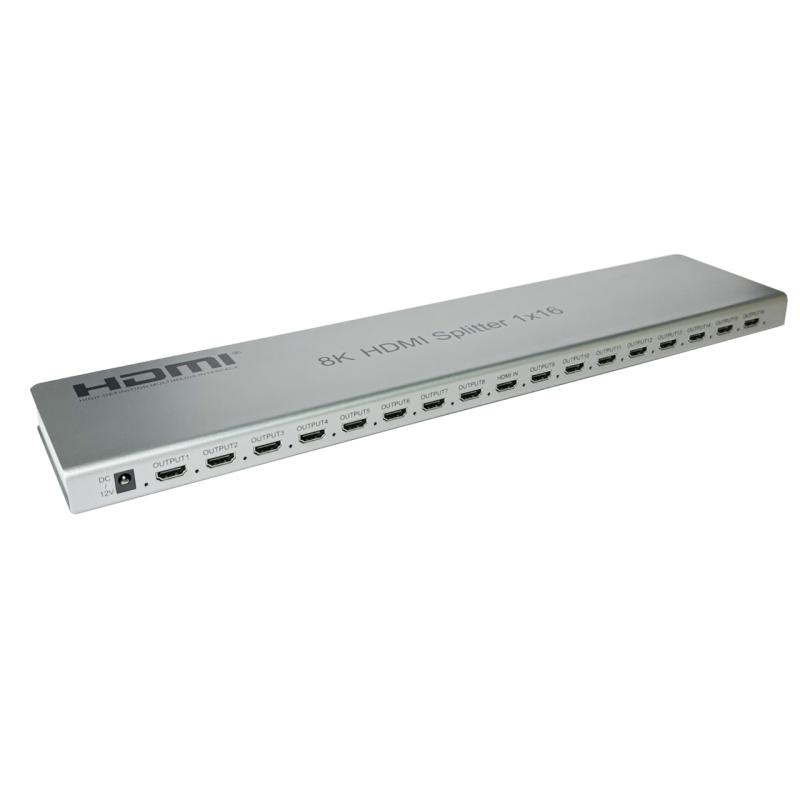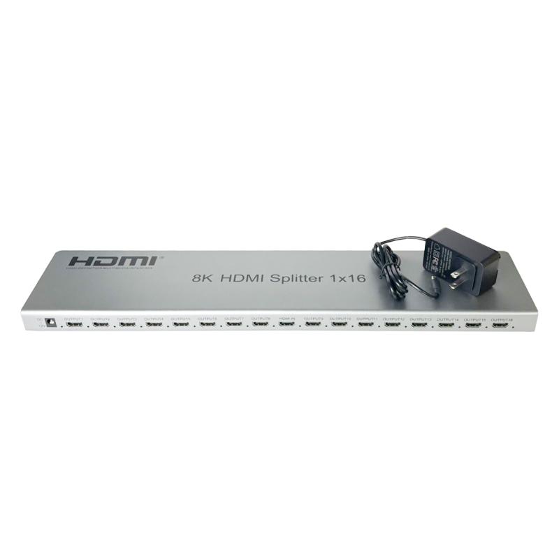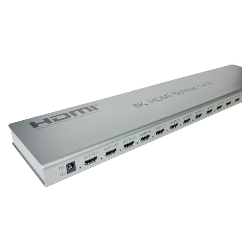 เป็นอุปกรณ์แบ่งสัญญาณ HDMI เข้า 1 ออก 16 ใช้แหล่งสัญญาณ HDMI เพียงแหล่งเดียว เพื่อเชื่อมต่อไปยังอุปกรณ์ปลายทาง HDMI หลายตัว ทำให้อุปกรณ์ HDMI เพียงเครื่องเดียวสามารถกระจายสัญญาณออกไปยังจอภาพหรือโปรเจ็กเตอร์ที่รองรับ HDMI ได้สูงสุด 16 เครื่อง ความละเอียดรองรับสูงสุดถึง 8K@60Hz ตัวอุปกรณ์ยังรองรับฟังก์ชันจัดการ EDID และมีโหมด EDID ให้เลือกทั้งหมด 8 แบบ ผู้ใช้งานสามารถเลือกใช้งานตามความต้องการของตนเองได้ อีกทั้งผลิตภัณฑ์รุ่นนี้ยังมีฟังก์ชันขยายสัญญาณ IR ในตัว สามารถทำงานร่วมกับอุปกรณ์ HDMI 2.0V repeater ของเรา ซึ่งมีตัวรับสัญญาณ IR-RX เพื่อรับคำสั่ง IR สำหรับควบคุมแหล่งสัญญาณได้