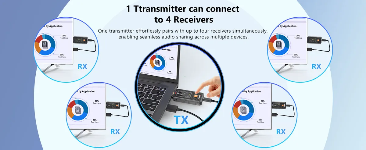 • สามารถใช้ TX 1 ตัว ส่งสัญญาณไปยัง RX ได้สูงสุด 4 ตัวพร้อมกัน เหมาะสำหรับห้องประชุม หรือการแสดงผลหลายจอ