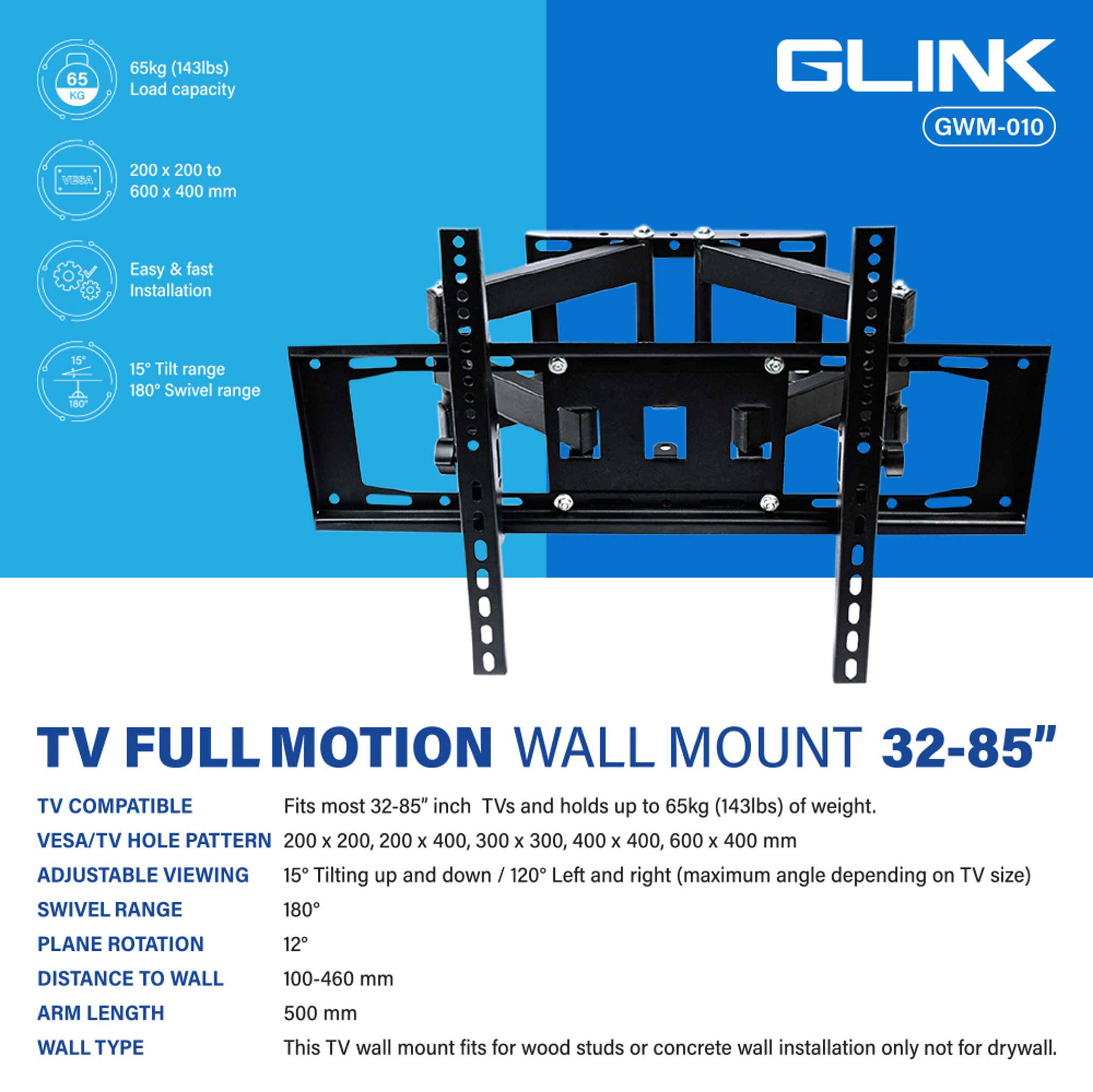 ขาแขวนทีวี แบบติดผนัง SIZE 32-85 นิ้ว FULL MOTION WALL MOUNT GLINK รุ่น GWM-010