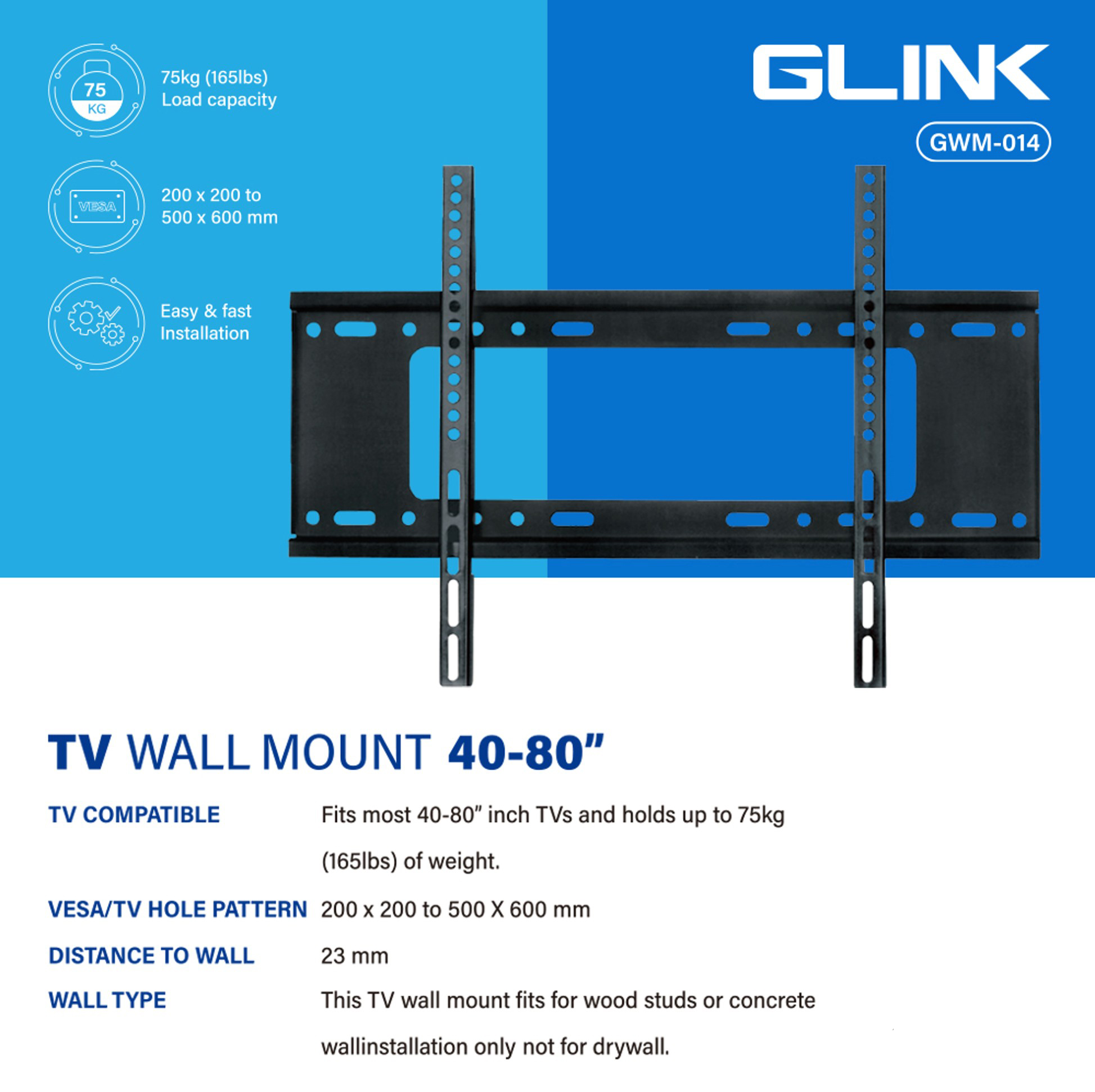 ขาแขวนทีวี แบบติดผนัง SIZE 40-80 นิ้ว FIXED MOUNT GLINK รุ่น GWM-014