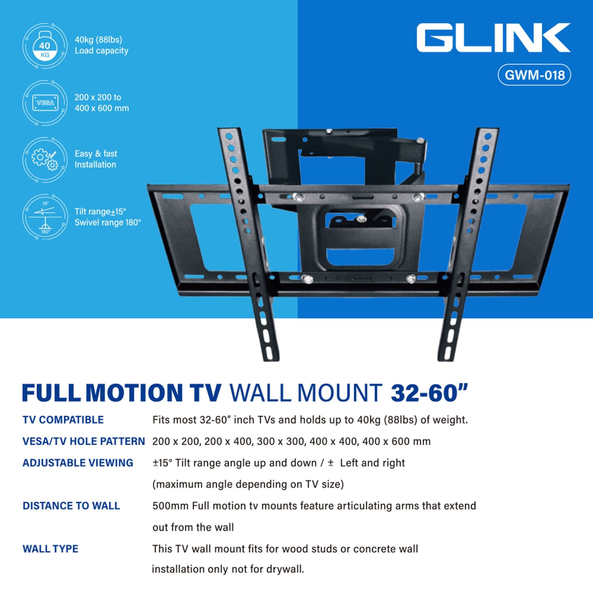 tags : ขาแขวนทีวี, ขาแขวนทีวีติดผนัง, ขาแขวนทีวีปรับได้, ขาแขวนทีวี Full Motion, ขาแขวนทีวี 32-60 นิ้ว, ขาแขวนทีวี GLINK, GLINK GWM-018, TV Wall Mount, Full Motion TV Mount, ขาแขวนทีวีหมุนได้, ขาแขวนทีวีปรับก้มเงย, อุปกรณ์ติดตั้งทีวี