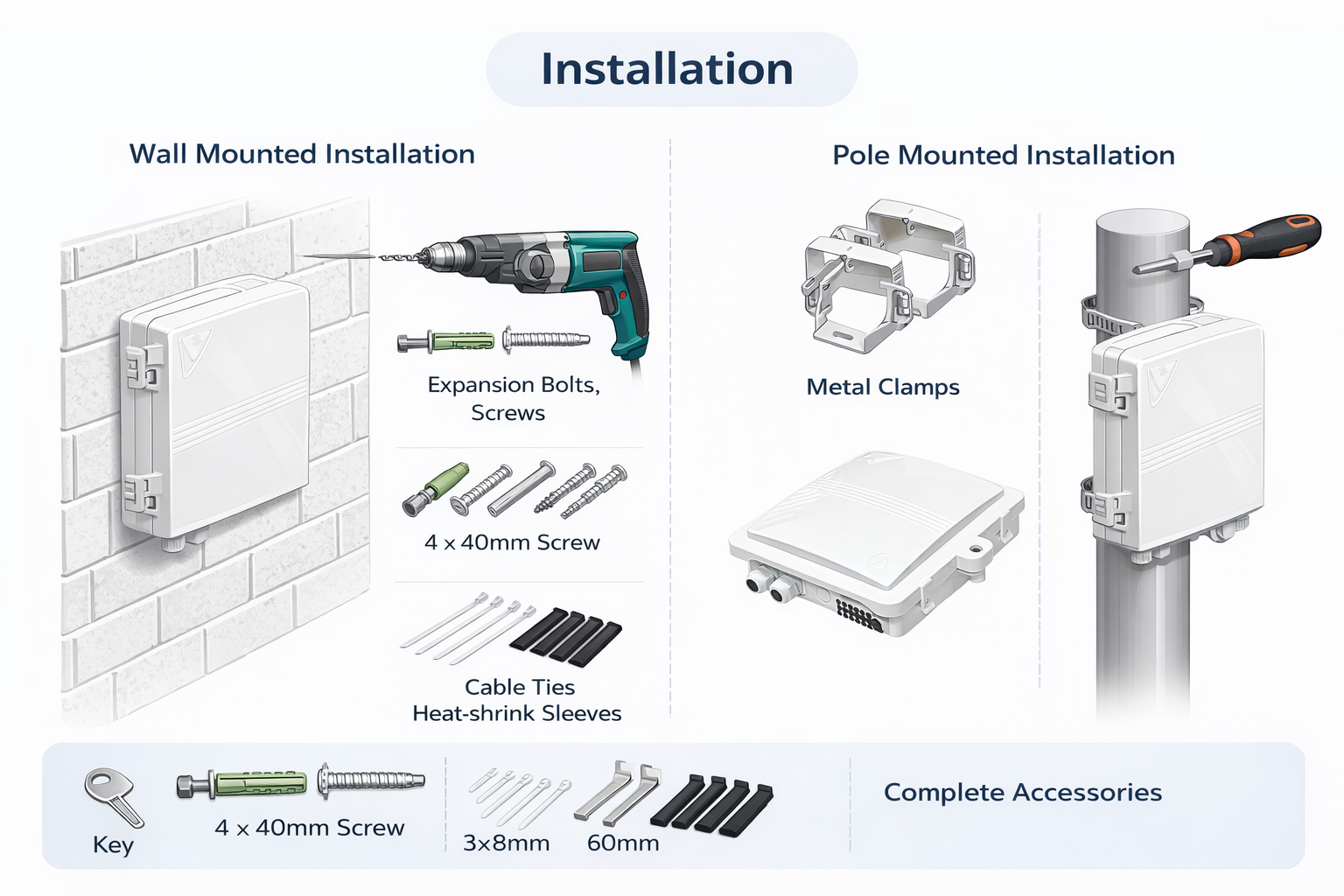 ออกแบบมาสำหรับงานติดตั้งภายนอกอาคาร (Outdoor) โดยเฉพาะ ตัวกล่องผลิตจากวัสดุคุณภาพสูง แข็งแรง ทนแดด ทนฝน และป้องกันน้ำได้ดี เหมาะสำหรับระบบ FTTH / FTTx / Fiber Network ช่วยจัดระเบียบสายไฟเบอร์ให้เรียบร้อย ปลอดภัย และดูเป็นมืออาชีพ