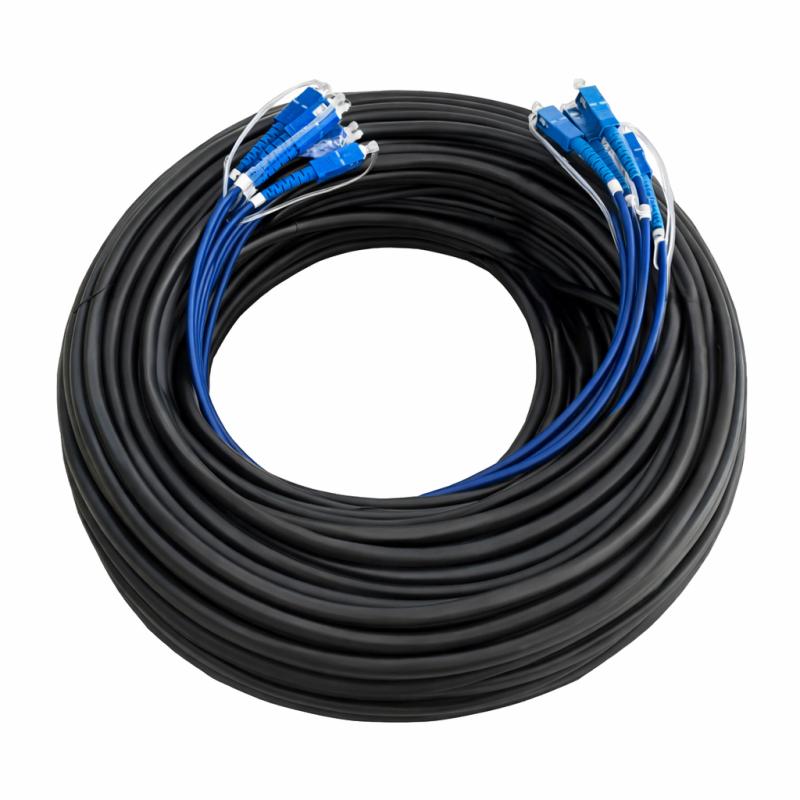 สายไฟเบอร์ออฟติกสำเร็จรูปแบบกลม ชนิดหุ้มเกราะ (Armored) ออกแบบมาสำหรับงานติดตั้งภายนอกและภายในอาคารที่ต้องการความทนทานสูง ป้องกันการกัดแทะจากสัตว์ เช่น กระรอก หรือหนู ภายในเป็นไฟเบอร์แบบ Single Mode (SM) จำนวน 4 Core พร้อมหัวคอนเนคเตอร์ SC/UPC ทั้งสองด้าน ใช้งานได้ทันทีโดยไม่ต้องเข้าหัวหรือสไปซ์ เหมาะกับงานระบบเครือข่าย, CCTV, FTTH และลิงก์ระหว่างอาคาร ระยะ 100 เมตร